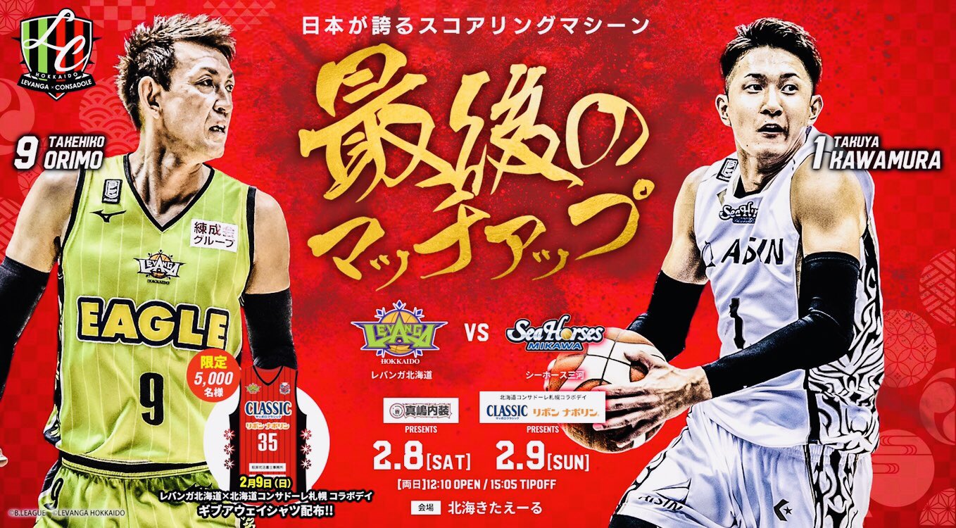 #レバンガ北海道 vs#シーホース三河 @#北海きたえーる 両日15:05 TIPOFF!! 2/9(日)は… レバンガ北海道 ×#北海道コンサドーレ札幌 コラボデイ 先着5,000名様にギブアウェイシャツ配布チケットはこちらから…