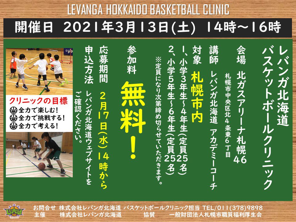#レバンガ北海道 バスケットボールクリニック開催のお知らせ📢開催日🗓3月13日(土)14時〜16時会場📍北ガスアリーナ札幌46初心者の... [レバンガ北海道【Twitter】]