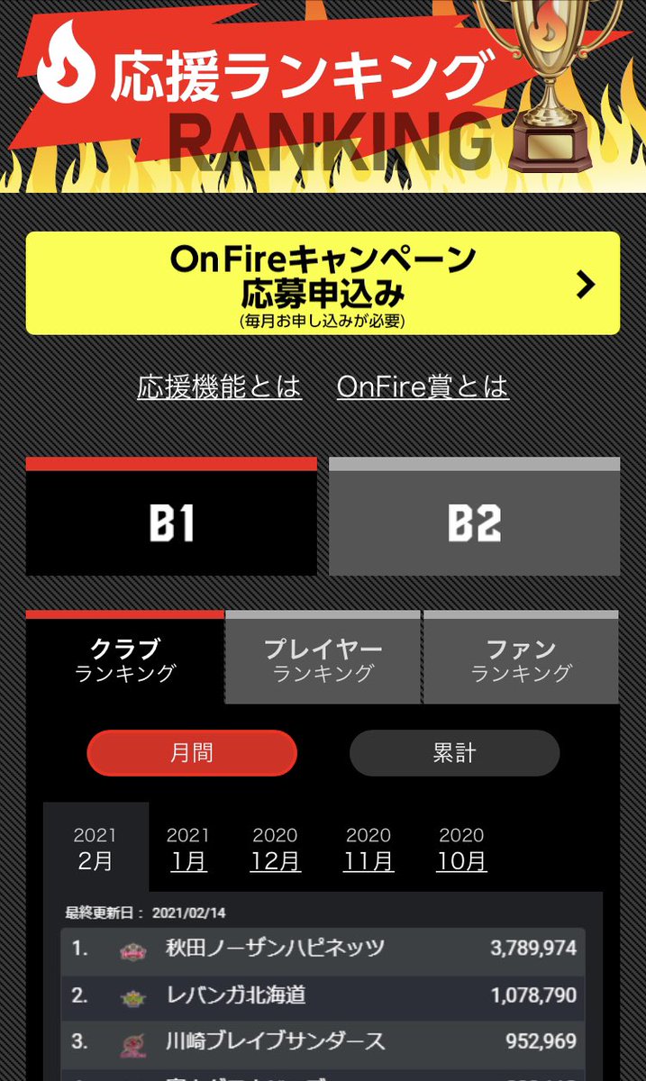 昨日も沢山の #ファイア ありがとうございました🙏✨2月応援ランキングの #秋田ノーザンハピネッツ さんに大きく差をつけられています... [レバンガ北海道【Twitter】]