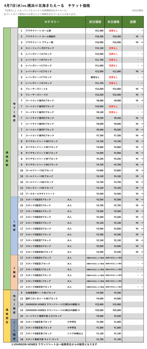 【チケット情報】3/31vs.新潟、4/7vs.横浜の3/2時点価格変動(本日3/2 19:00からレギュラー会員先行販売開始)▽購入はこち... [レバンガ北海道【Twitter】]