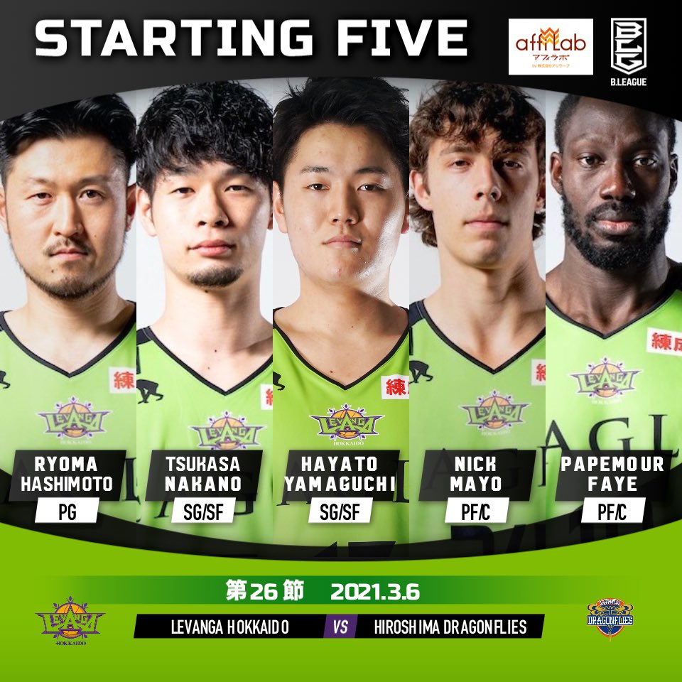 【Today's Starting5】0 #橋本竜馬7 #中野司10 #ファイパプ月瑠17 #山口颯斗24 #ニック・メイヨ#Bリーグ 20... [レバンガ北海道【Twitter】] | レバンガ北海道