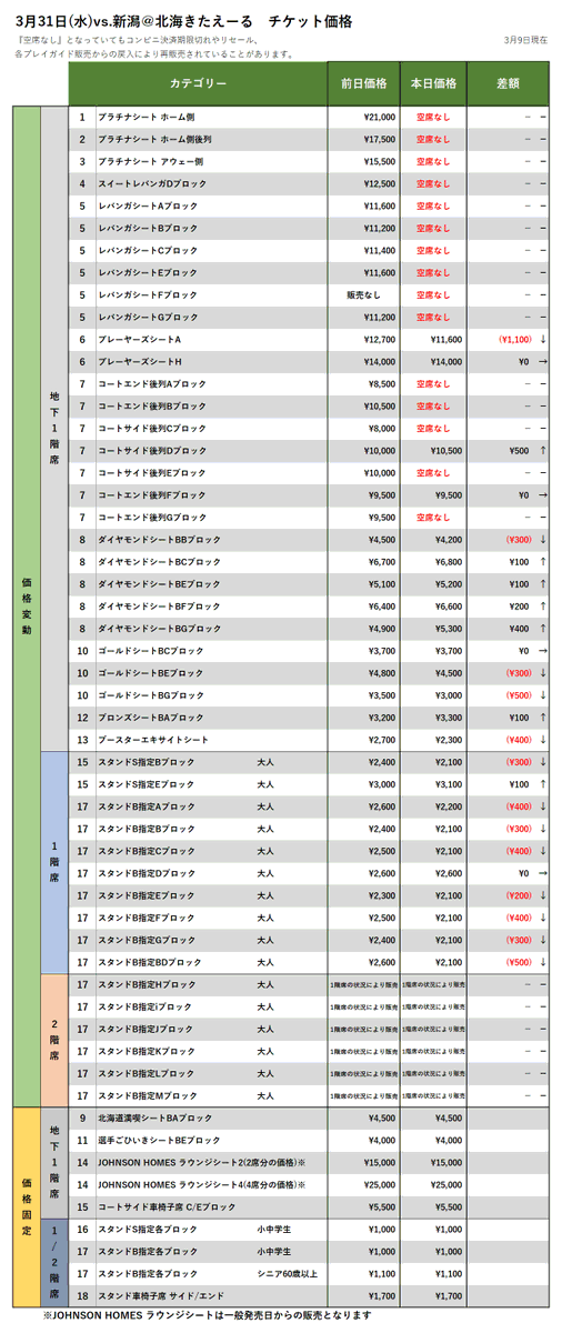 【チケット情報】3/31vs.新潟、4/7vs.横浜の3/9時点価格変動(現在、FC会員・一般販売中!)▽購入はこちらから▽https://... [レバンガ北海道【Twitter】] | レバンガ北海道