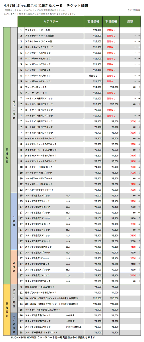 【チケット情報】3/31vs.新潟、4/7vs.横浜の3/22時点価格変動(現在、FC会員・一般販売中!)▽購入はこちらから▽https:/... [レバンガ北海道【Twitter】] | レバンガ北海道