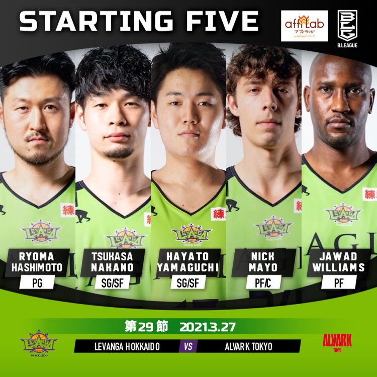 【Today's Starting5】0 #橋本竜馬7 #中野司17 #山口颯斗24 #ニック・メイヨ31 #ジャワッド・ウィリアムズ#Bリ... [レバンガ北海道【Twitter】] | レバンガ北海道