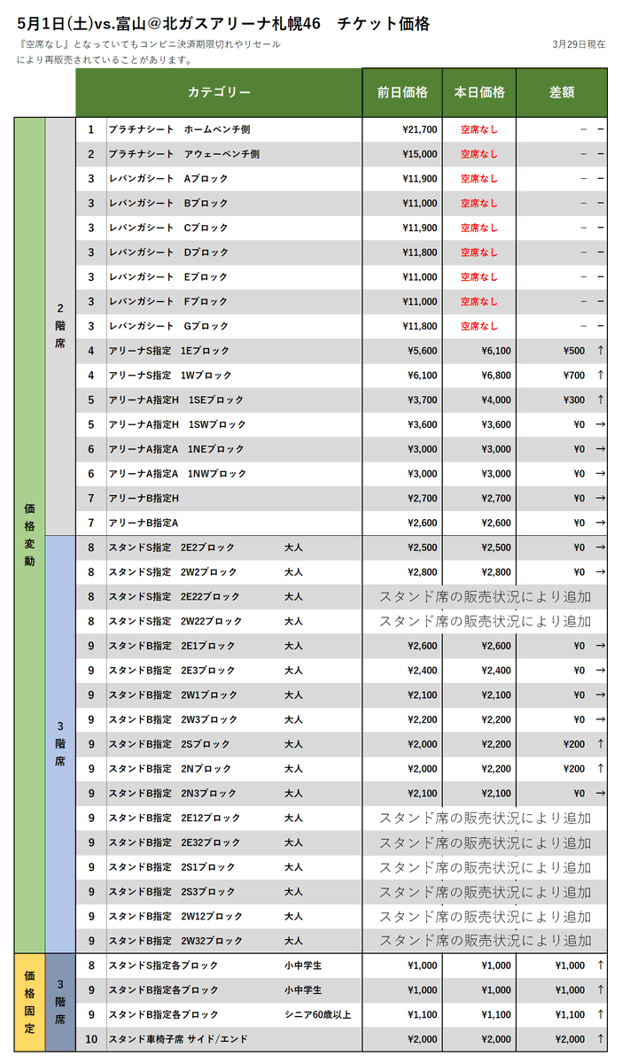 【チケット情報】5/1-2vs.富山の3/29時点価格変動(現在、プレミアムプラス/プレミアム会員先行販売中!レギュラー会員先行販売は3/3... [レバンガ北海道【Twitter】]