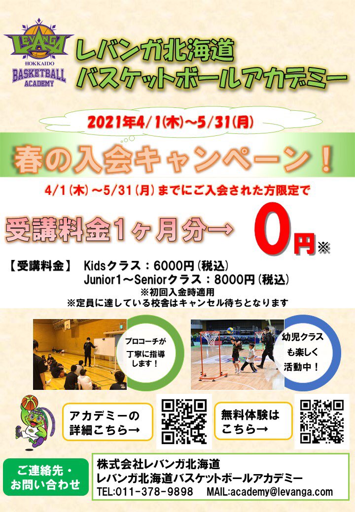 #レバンガ北海道 バスケットボールアカデミーでは4/1(木)〜5/31(月)までの期間『春の入会キャンペーン』を実施いたします🌸期間内で.... [レバンガ北海道【Twitter】] | レバンガ北海道