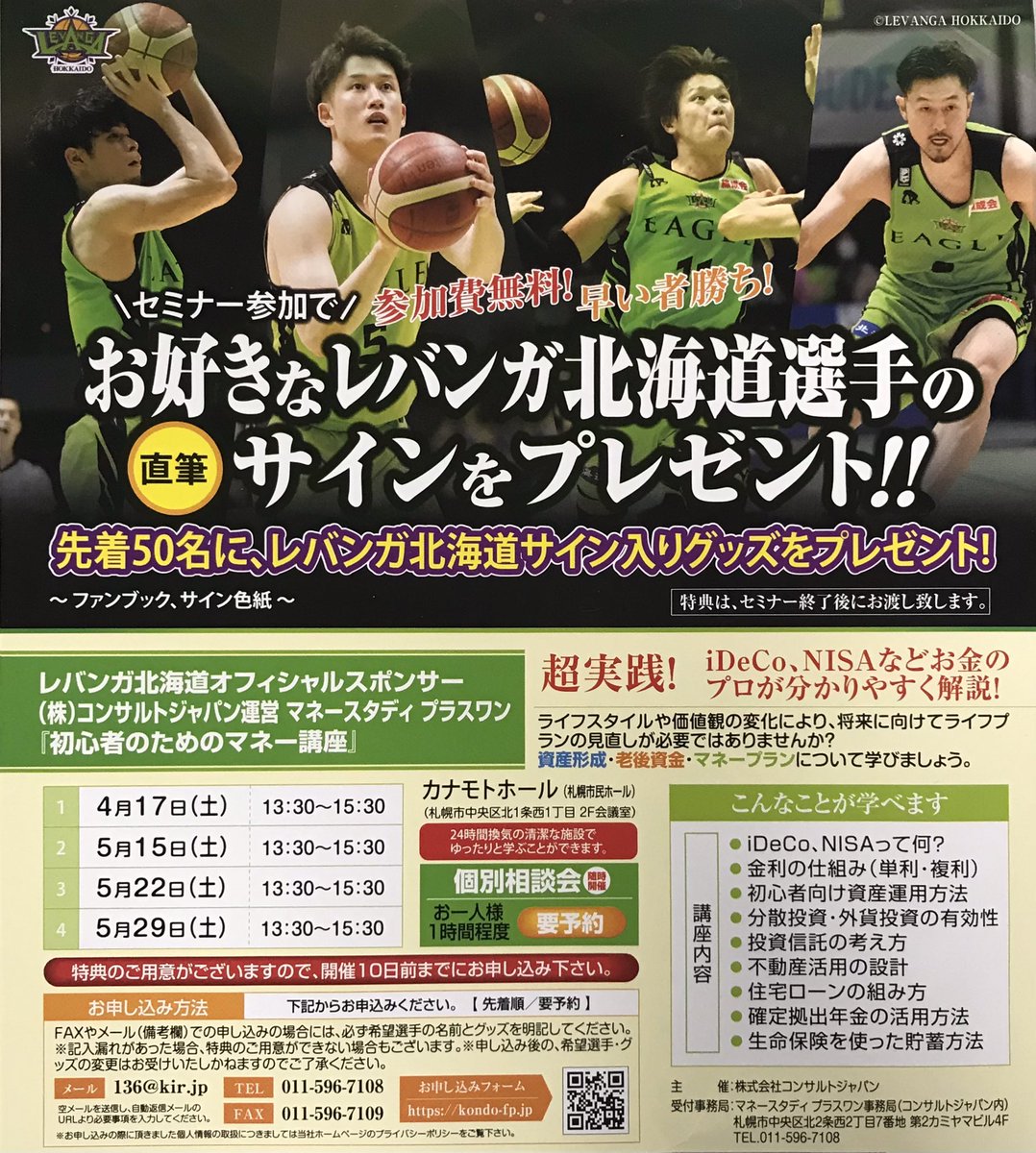 オフィシャルスポンサーの #コンサルトジャパン 様主催『初心者のためのマネー講座』へご参加いただきますと先着50名様に #レバンガ北... [レバンガ北海道【Twitter】] | レバンガ北海道