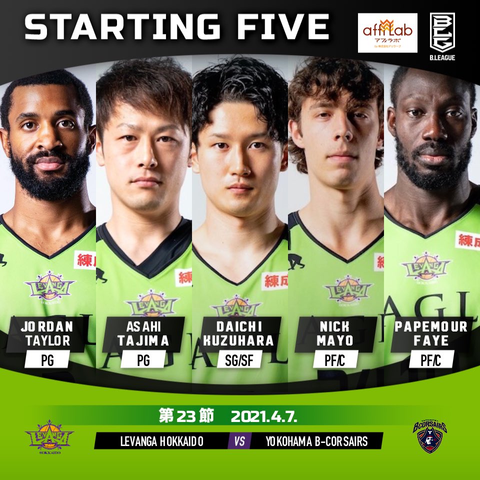 【Today's Starting5】2 #ジョーダン・テイラー5 #葛原大智8 #多嶋朝飛10 #ファイパプ月瑠24 #ニック・メイヨ#B... [レバンガ北海道【Twitter】] | レバンガ北海道