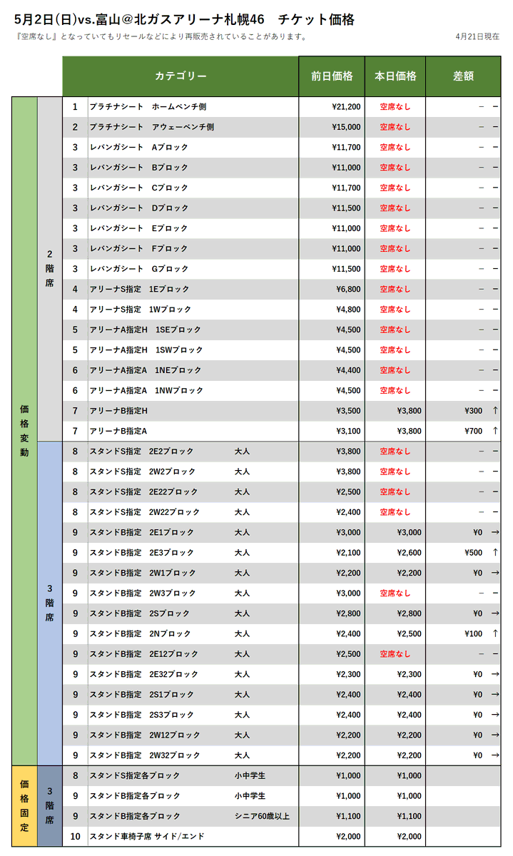 【チケット情報】5/1-2vs.富山の4/21時点価格変動(現在、FC会員・一般販売中!)▽購入はこちらから▽https://t.co/fA... [レバンガ北海道【Twitter】]