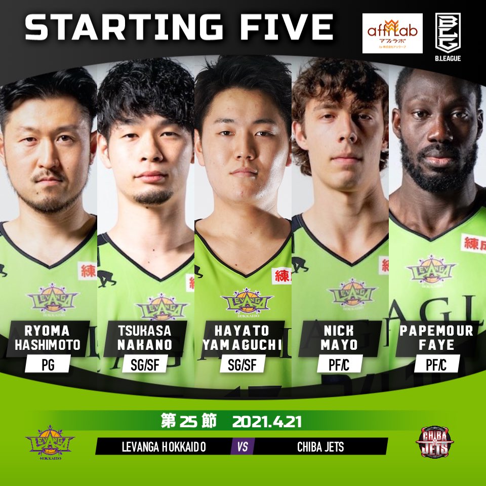 【Today's Starting5】0 #橋本竜馬7 #中野司17 #山口颯斗10 #ファイパプ月瑠24 #ニック・メイヨ#Bリーグ 20... [レバンガ北海道【Twitter】] | レバンガ北海道