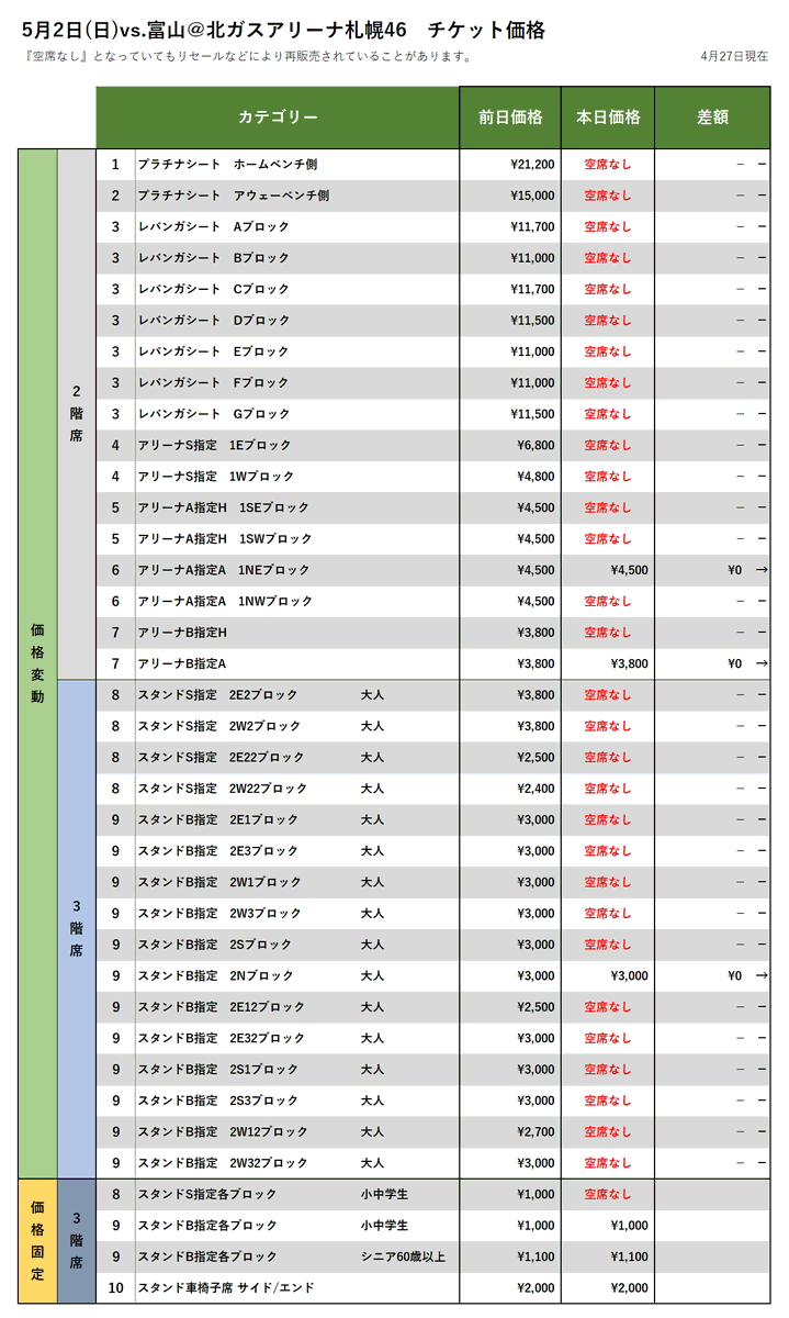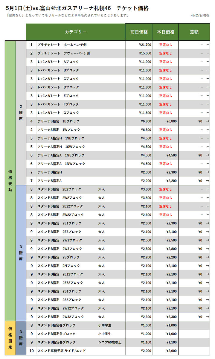 【チケット情報】5/1-2vs.富山の4/27時点価格変動(現在、FC会員・一般販売中!)▽購入はこちらから▽https://t.co/fA... [レバンガ北海道【Twitter】]