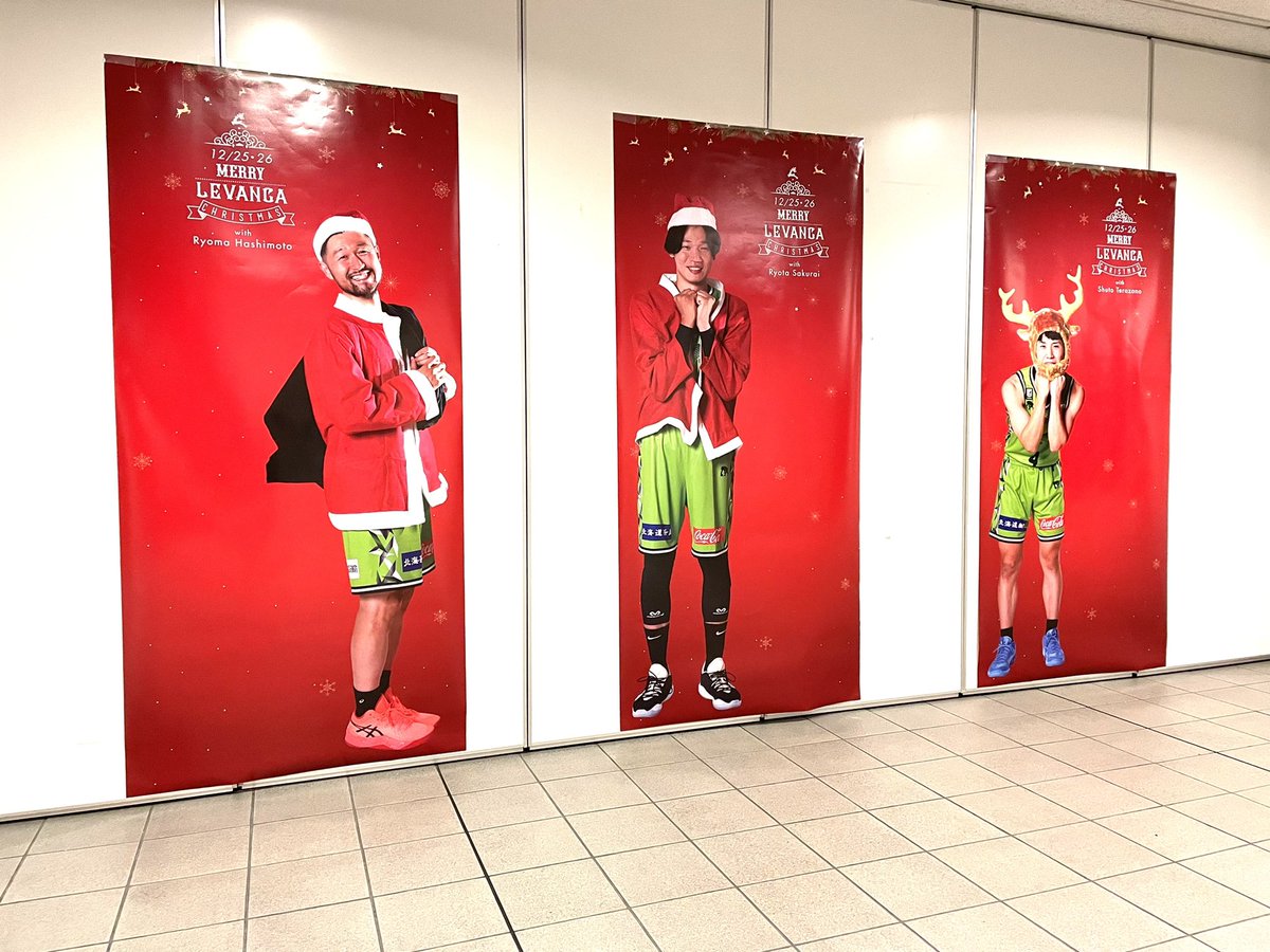 会場地下1階にクリスマスフォトスポット登場🎅🎅🦌📸#橋本竜馬 #桜井良太 #寺園脩斗 3選手がクリスマスコスチュームに身を包んだ等身... [レバンガ北海道【Twitter】] | レバンガ北海道