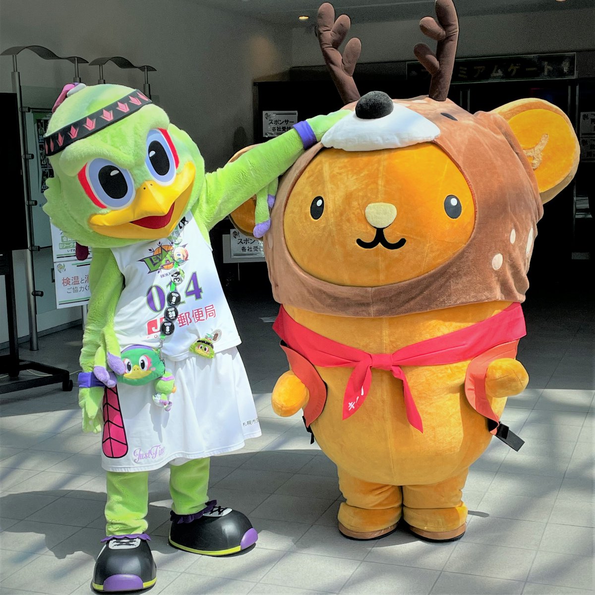 北海道観光PRキャラクターの #キュンちゃん とレバード🦜💚 #北海道観光振興機構 のブースでは、【先着1000名さま】✔勾玉クッキー✔... [レバンガ北海道【Twitter】]