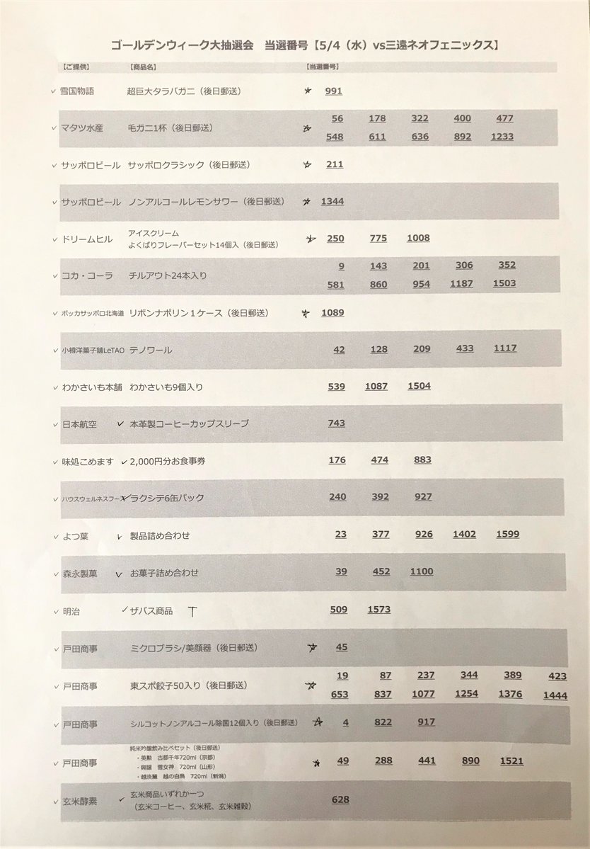 本日5/4(水祝)の『ゴールデンウイーク大抽選会』🎯当選番号の発表です🎊📣当選された方は💁【1階 特設ブース】にて当選番号の券をご提... [レバンガ北海道【Twitter】]