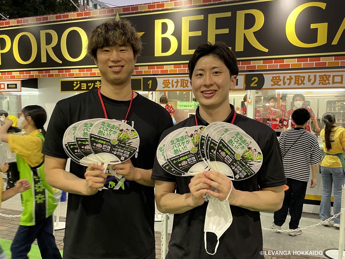 寺園選手、荒川選手、ナナー選手、中野選手、高橋選手、松下選手が3日間に渡り、#THEサッポロビヤガーデン にて9月のプレシーズンゲームと10月1日-2日の今季開幕戦をPRするうちわを配布しました🍻🏀