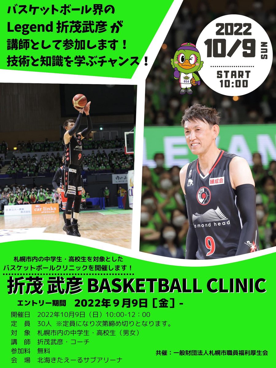 【お知らせ】札幌市内在住の中高生必見👀一般財団法人札幌市職員福利厚生会さまのご協力 で、10/9(日)に #折茂武彦 によるバスケットボールクリニックを開催します🏀🔥