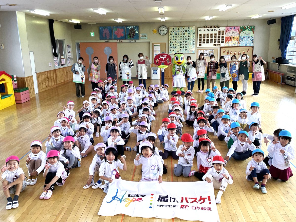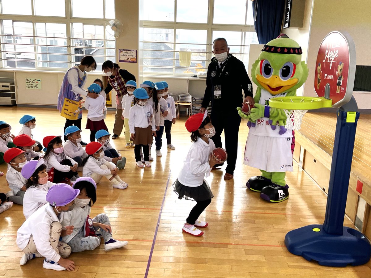 「届け、バスケ! supported by #日本郵便」事業として #レバンガ北海道 のマスコットキャラクター #レバード が #大藤学園もみじ台幼稚園 を訪問し、バスケットゴールとボールを贈呈しました🏀✨