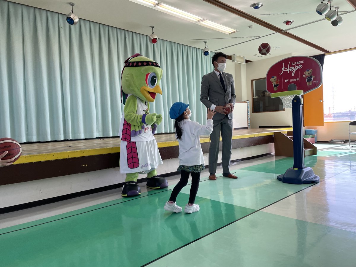 「届け、バスケ! supported by #日本郵便」事業として #レバンガ北海道 のマスコットキャラクター #レバード が #大藤学園北野しらかば幼稚園 を訪問し、バスケットゴールとボールを贈呈しました🏀✨