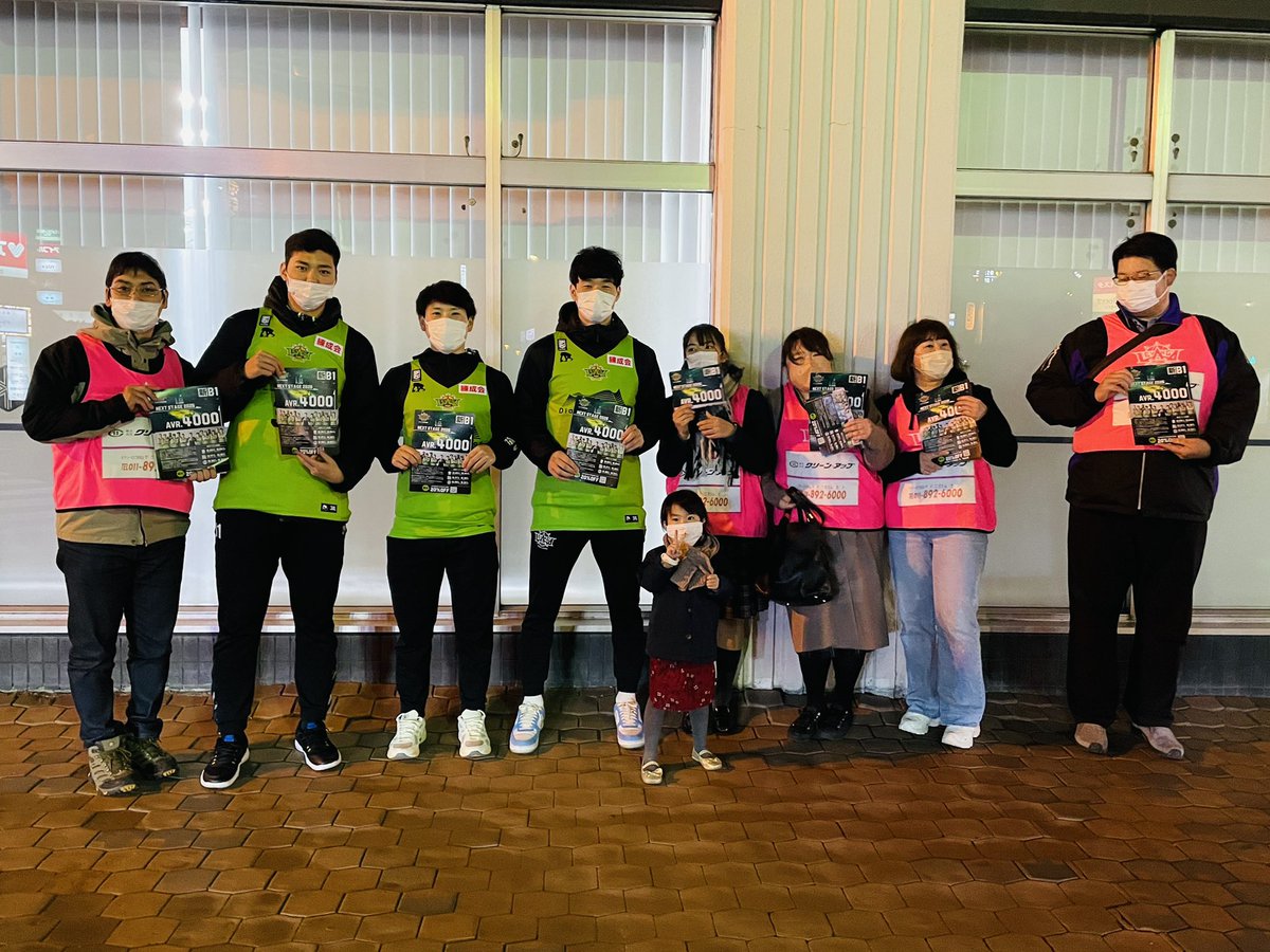チラシ配布にご協力くださったボランティアの皆さまと、急きょ参戦した選手・チームスタッフたちと、配布終了後に記念撮影📸