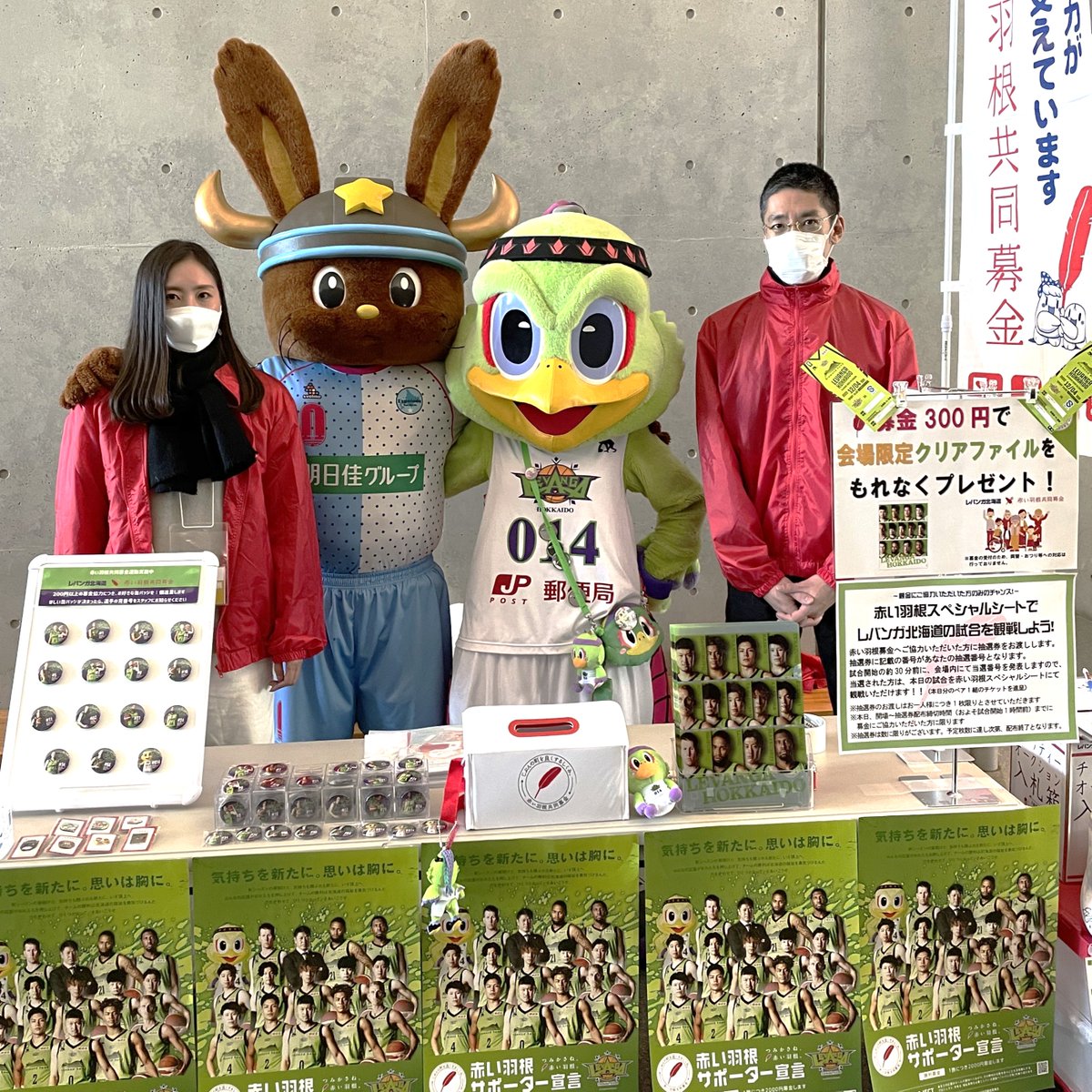本日も【#赤い羽根共同募金ブース】にて、募金活動を実施中🪶🌈今節より🏀300円募金🙏💚会場限定の #クリアファイル200円募金🙏... [レバンガ北海道【Twitter】] | レバンガ北海道