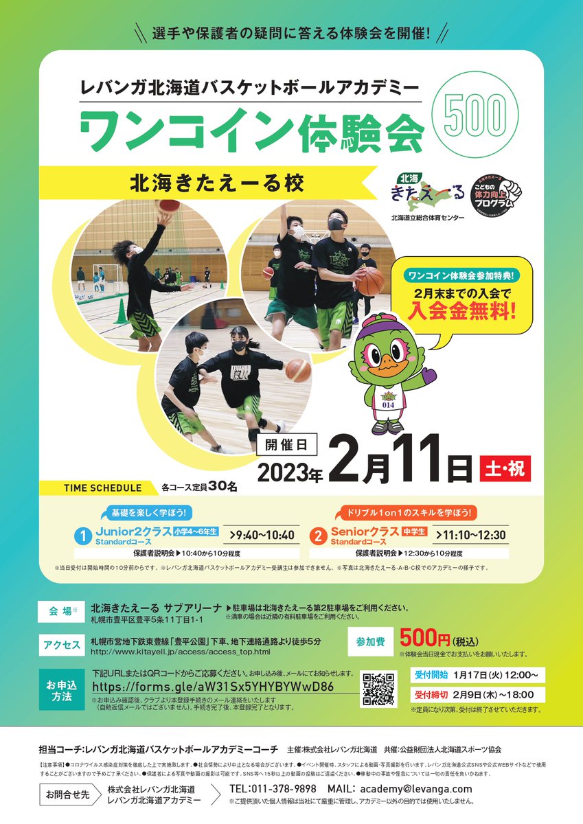 【お知らせ】#レバンガ北海道アカデミー ワンコイン体験会🪙人気の #北海きたえーる校 で開催決定✨入会を迷われている方にもオススメで... [レバンガ北海道【Twitter】]