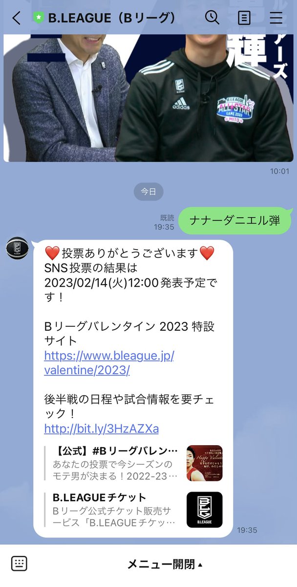 🍫投票のお願い🙏①Bリーグ公式LINEアカウントを開く②左下の四角をタップ③入力画面に『ナナーダニエル弾』と打って送信④投票完了LI..... [レバンガ北海道【Twitter】]