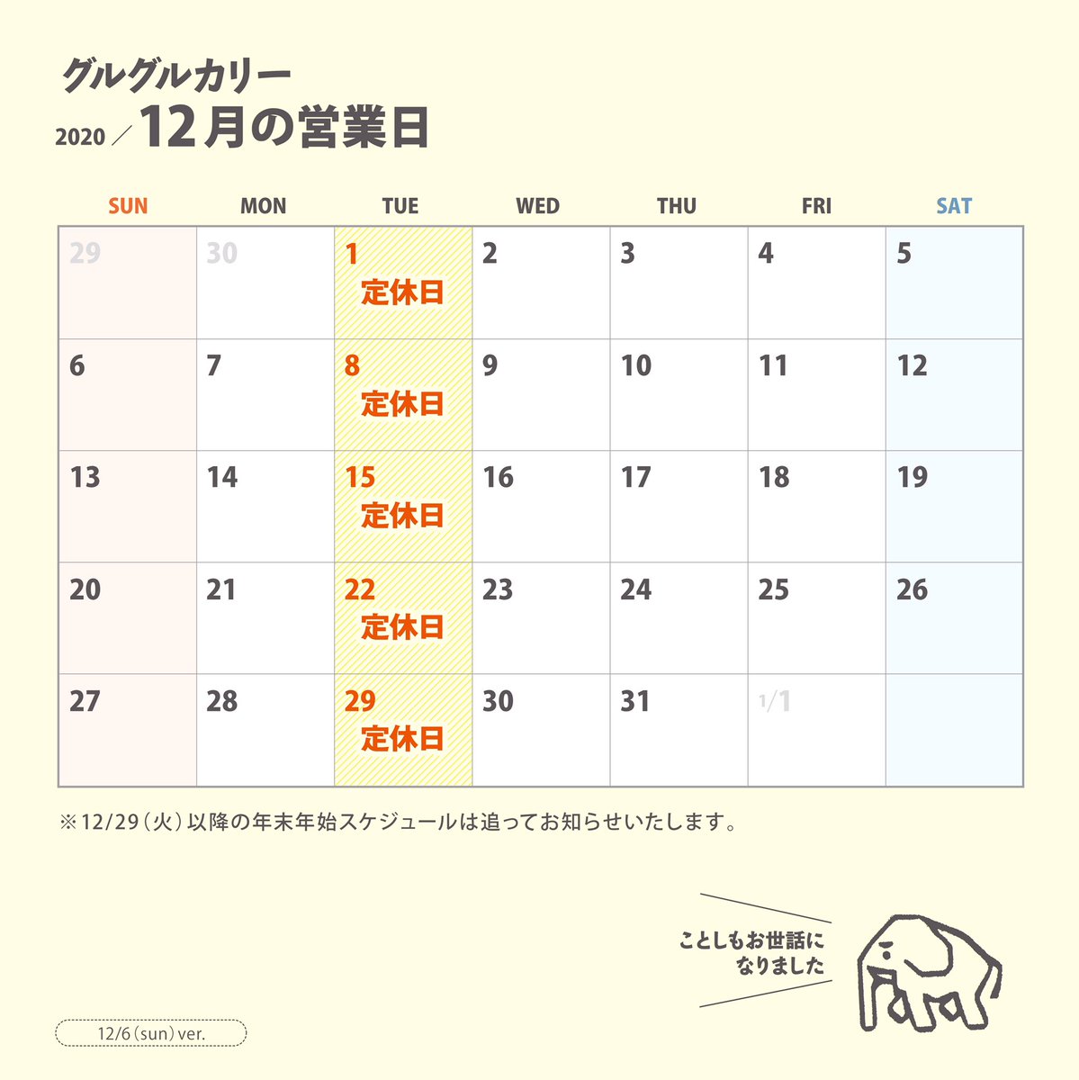 遅くなりました~💦12月の予定です。そして年末年始の営業、今年はかなり悩みどころなのであります。今週末、集中対策期間がどうなるか... [グルグルカリー【Twitter】] | グルグルカリー