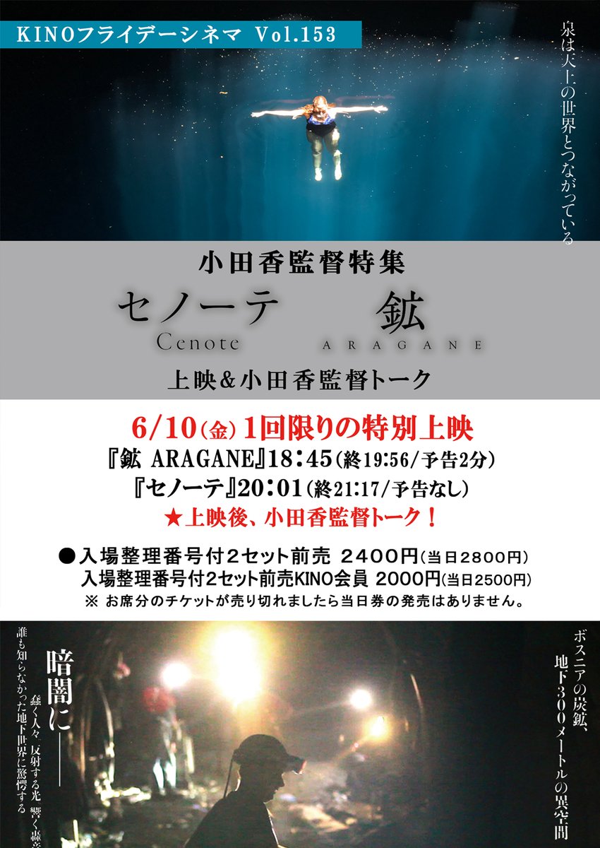 KINOフライデーシネマvol.1536/10(金)1回限りの特別上映【セノーテ】【鉱 ARAGANE】上映&小田香監督トーク/上映時間決定... [シアターキノ【Twitter】]
