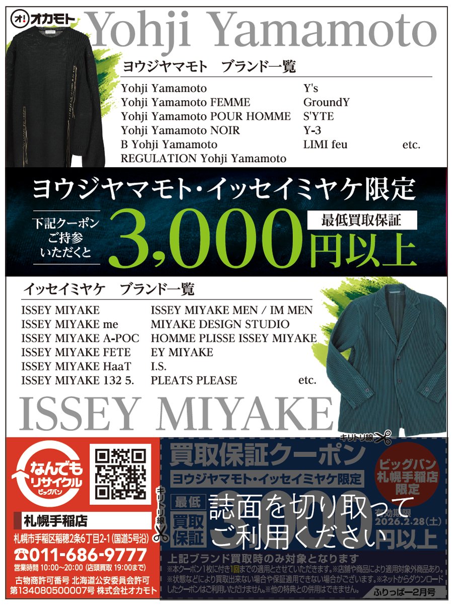 ヨウジヤマモト・イッセイミヤケ限定 最低買取保証 3,000円以上 | ビッグバン 札幌手稲店