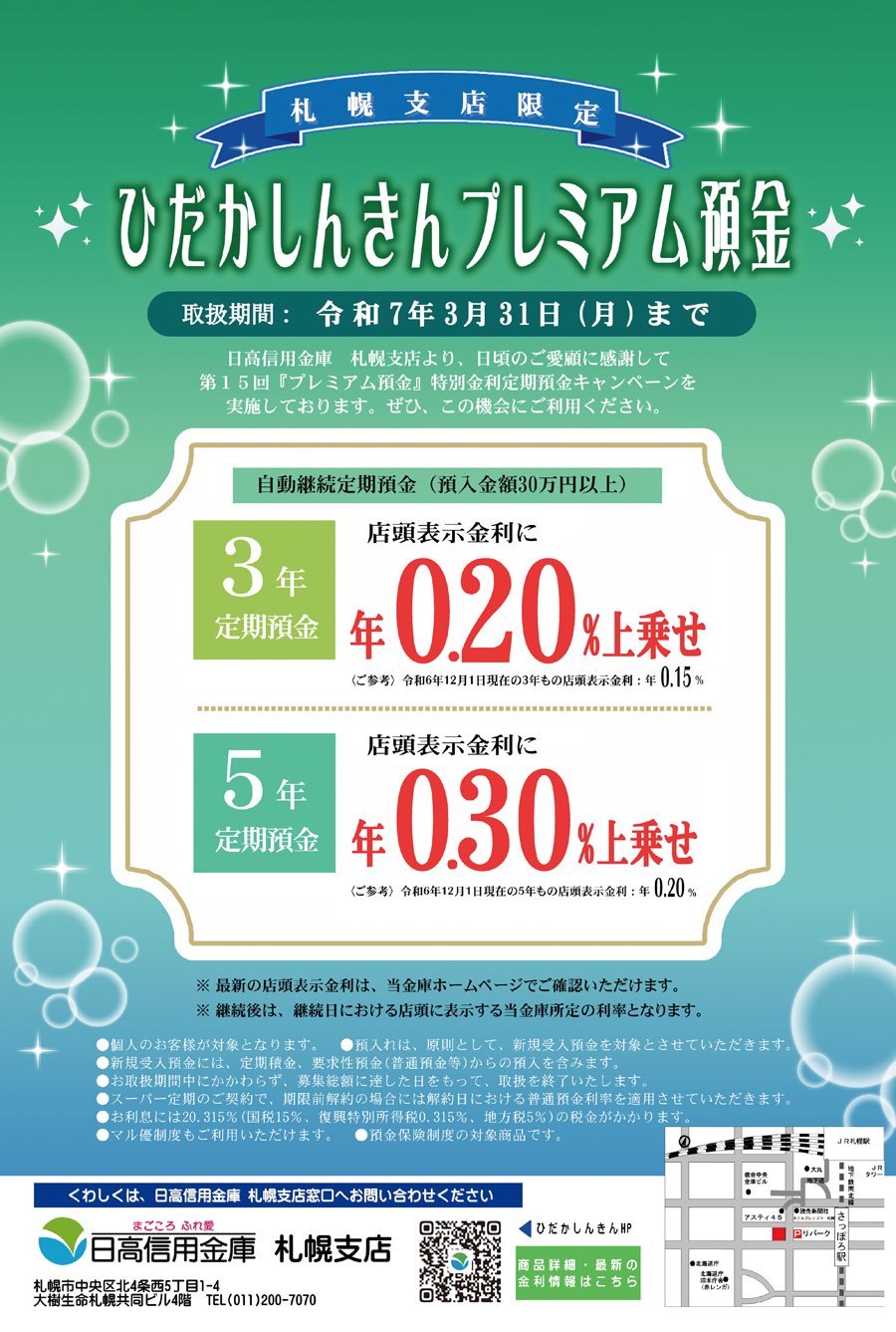 ひだかしんきんプレミアム預金 | 日高信用金庫 札幌支店