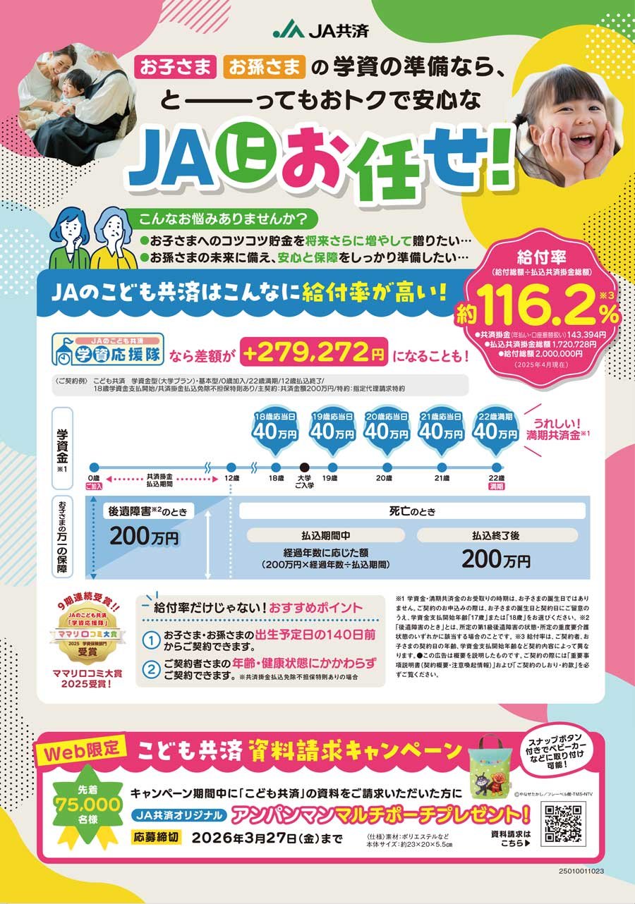 お子さまお孫さまの学資の準備なら、 JAのこども共済はこんなに給付率が高い! とーってもおトクで安心なJAにお任せ! | JAさっぽろ