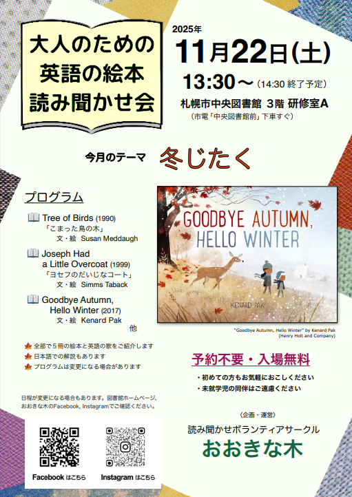 | お問い合わせ | 英語の絵本読み聞かせボランティアサークル おおきな木 代表 魚住 (うおずみ) 電話 090-5958-1434 Eメール ookinaki2000@gmail.com |