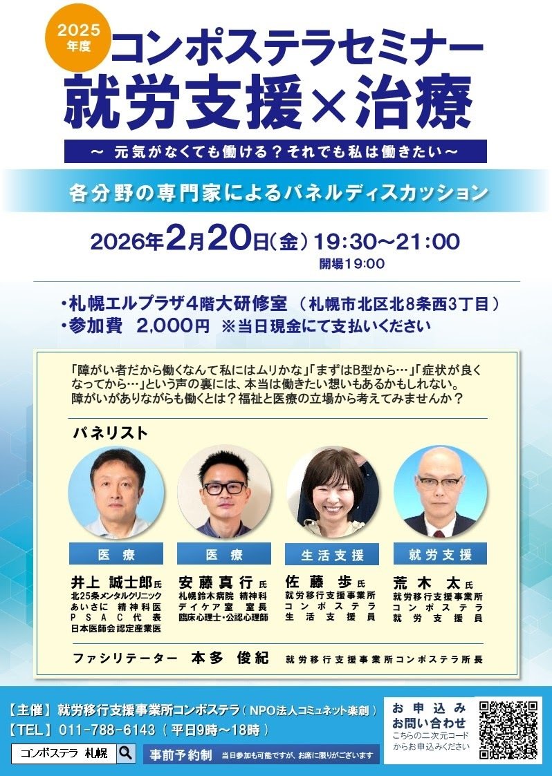 | お問い合わせ | 主催就労移行支援事業所コンポステラ(NPO法人コミュネット楽創) 電話011-788-6143(平日9時~18時 |