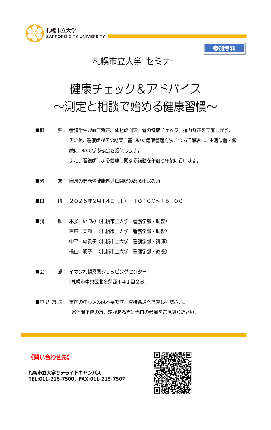 | お問い合わせ | 札幌市立大学サテライトキャンパス(札幌市中央区きた4条西5丁目アスティ45ビル 12階) 電話011-218-7500 |