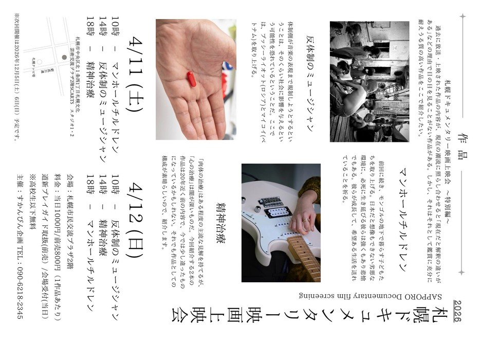 | 時間 | 1日3回。10時、14時、18時に上映。プログラムはそれぞれ別の内容です。 |